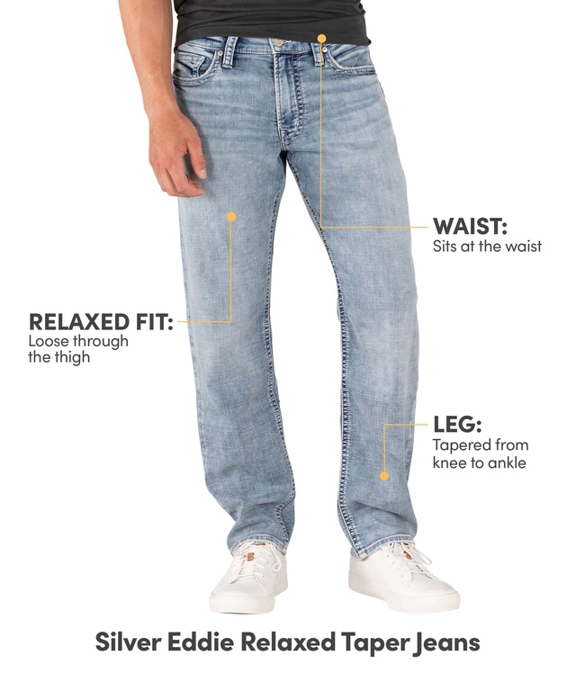 Eddie is for guys who want a modern fit but need more room in the thighs. It features a Athletic Fit that tapers below the knee for a clean look. This pair's crafted with Silver Jeans' ultimate stretch denim that looks like traditional denim but feels like your most comfortable sweats. Finished with the brand's signature s-scrolls on the back pockets.