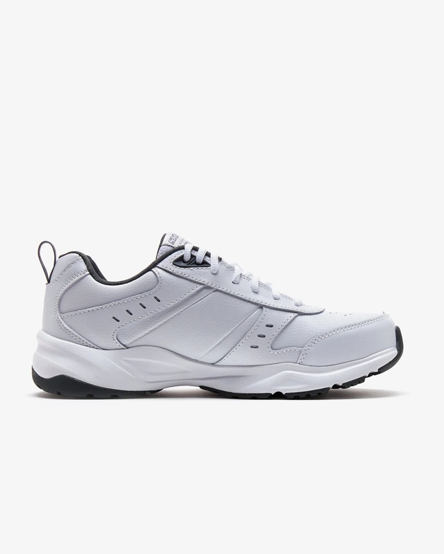 A traditional sporty sneaker design from Skechers, these Haniger shoes have perforated panels in the leather-synthetic uppers that have a cooling effect on hot days. Memory foam insoles provide cushioning while the lightweight midsoles absorb shock. With flexible rubber, high-traction outsoles, these sneakers have a fuller athletic-depth heel for walking comfort. They're available in a 2E width.