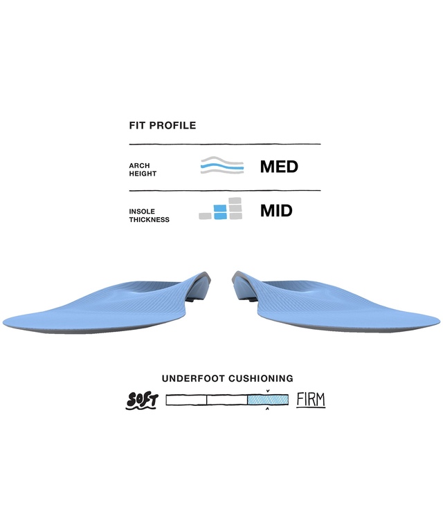 Medium arch orthotic support reduces stress on feet, ankles, knees, and back