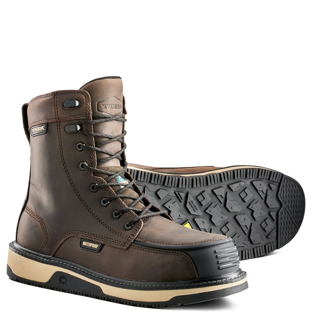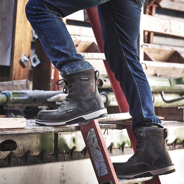 From Terra. these Ironstone 8" Wedge work boots feature waterproof construction, the Omnicore comfort system and Terra Dura-Moc TPU toe bumpers for increased abrasion resistance. They meet CSA Grade 1 standards with composite toes and plates.