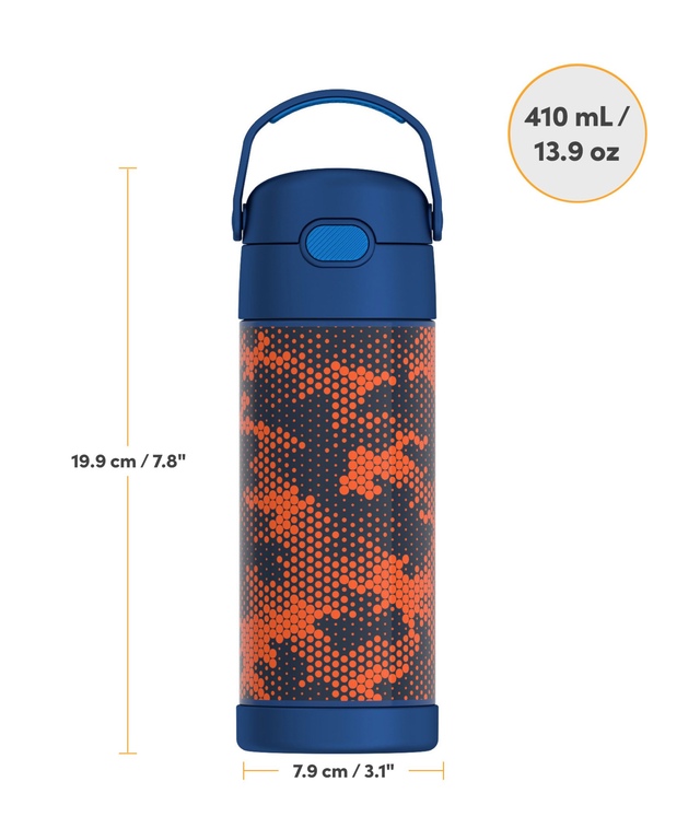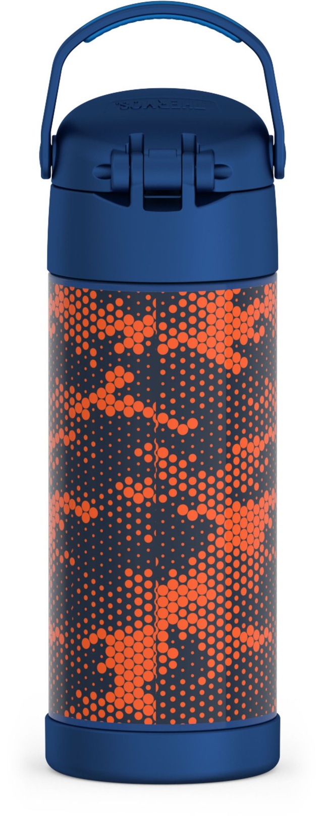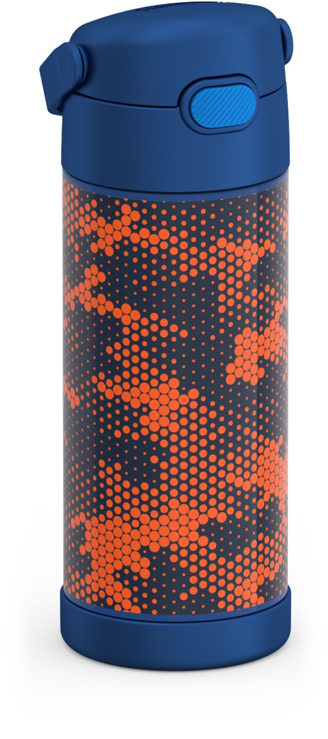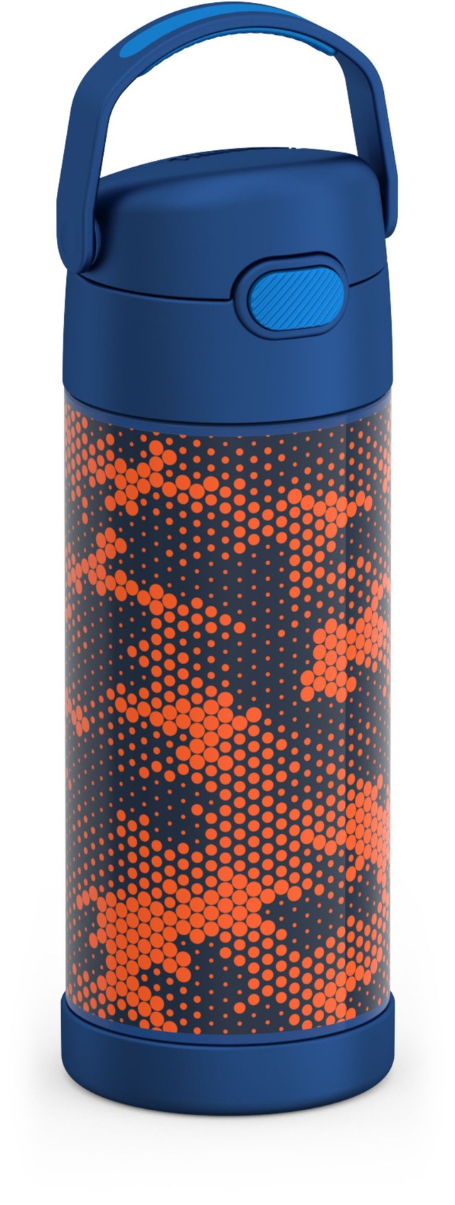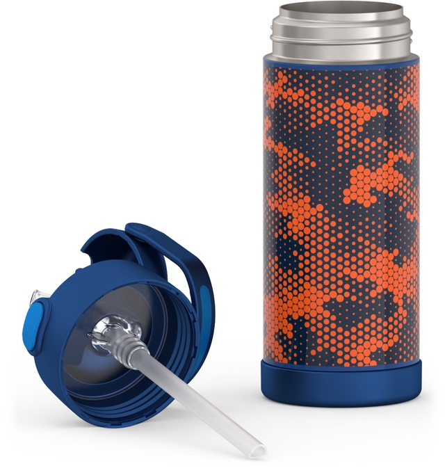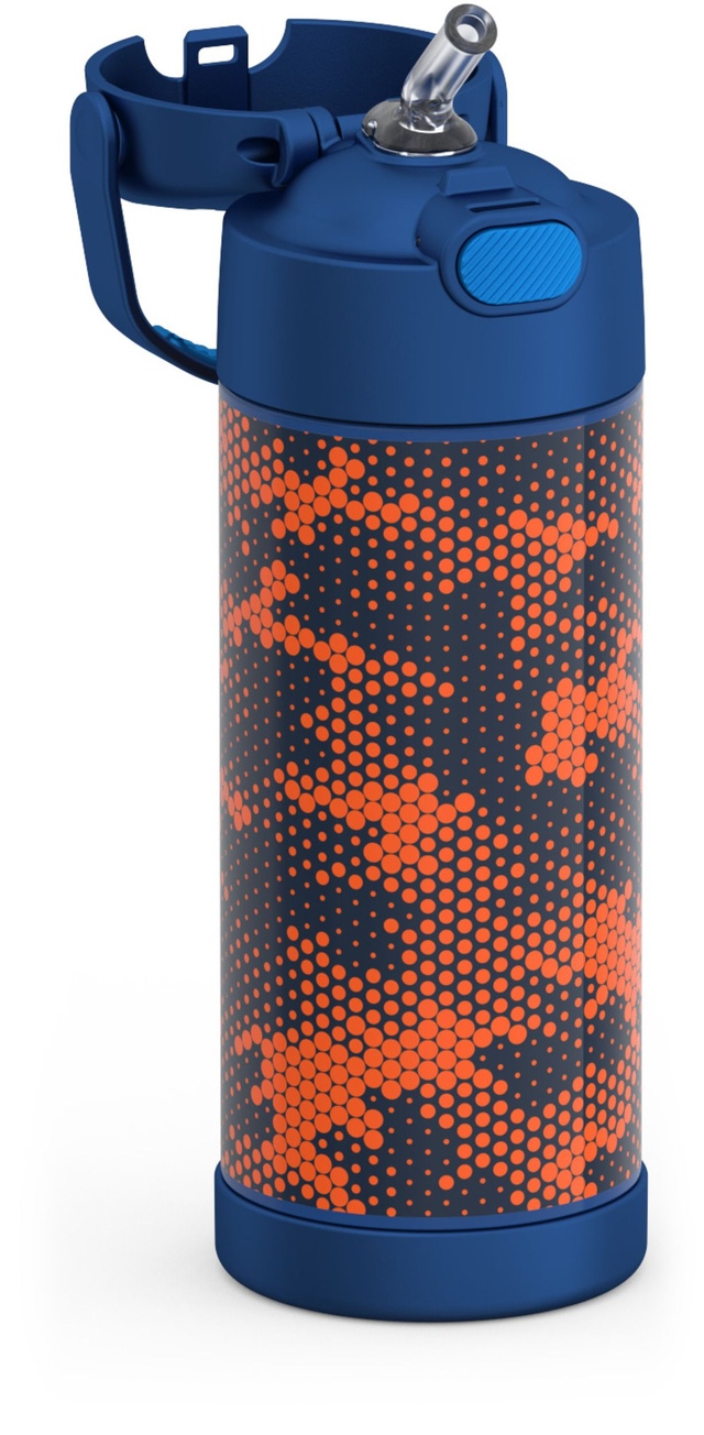 Designed to keep drinks cold for up to 12 hours, the Thermos FUNtainer Vacuum Insulated Stainless Steel Water Bottle includes an hygienically covered silicone straw. Made from BPA-free materials, the double wall stainless steel construction is built to handle drops, dings and assorted roughhousing. This bottle includes an integrated carry handle that can be folded down when not in use.