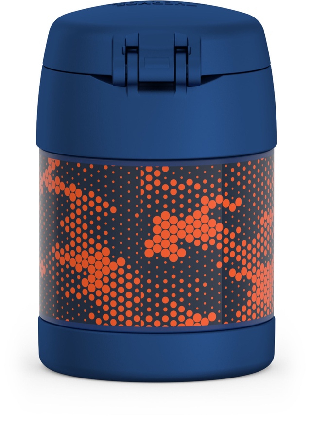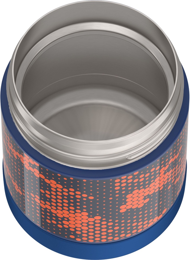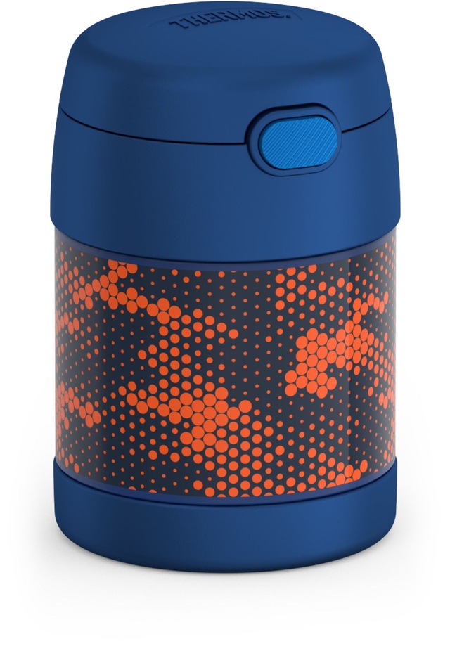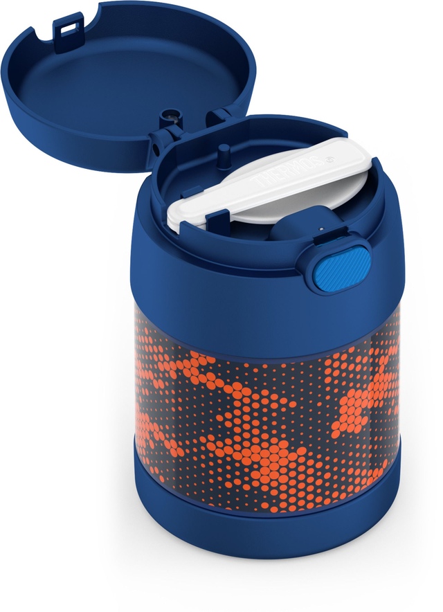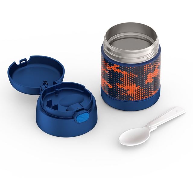 This Thermos® FUNtainer® Food Jar for kids is vacuum insulated to keep hot foods hot and cold foods cold. The food jar is lightweight and compact with a push button lid that's easy to carry and open. It has a wide mouth opening that makes it easy to fill and to eat from using the folding spoon. You can customize the FUNtainer food jar by attaching one of the included adhesive name labels.