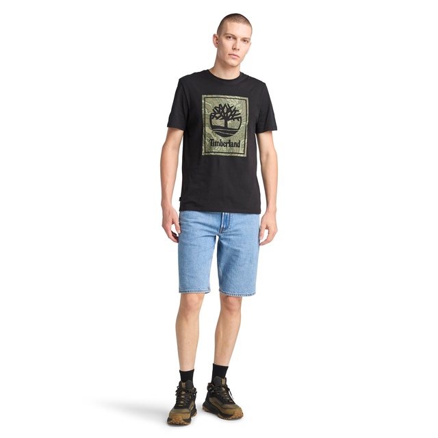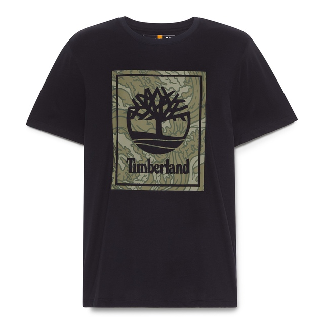 Get ready for summer temps in this graphic tee from Timberland. Made of 100% cotton for breathable comfort, it sports a stacked tree logo on the back and a simpler version on the front.
