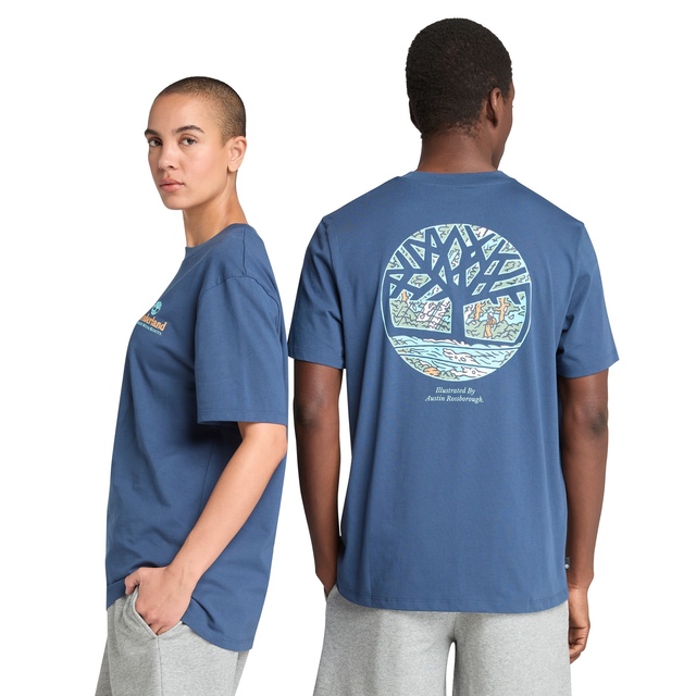 Share the spirit of the outdoors wearing this Timberland T-Shirt, emblazoned with artist Austin Rossborough tree graphics front and back. Made in 100% organic cotton, it's naturally breathable for summer comfort.