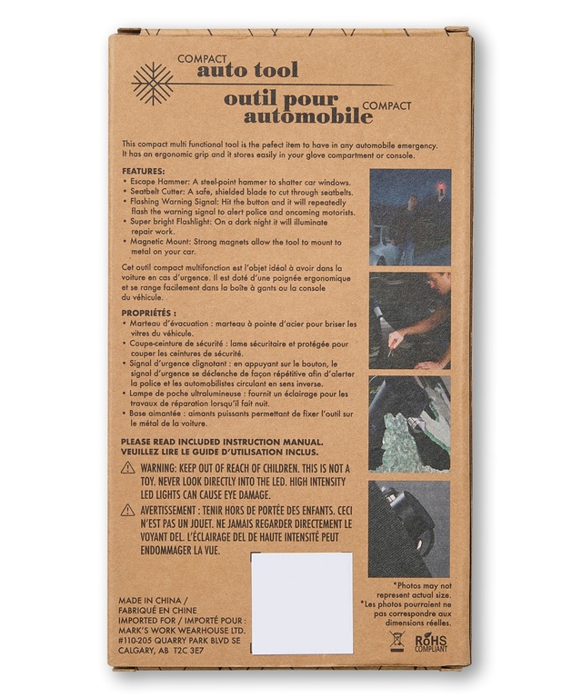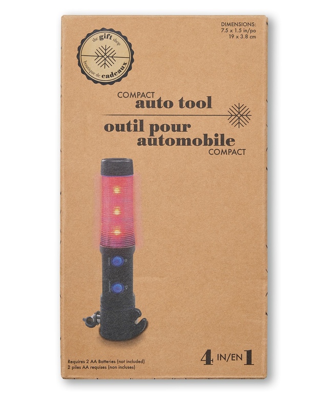 The auto emergency multi-tool is made of strong, durable plastic, featuring an ergonomic grip for performance when you need it most. It features a set of safety features that offer assistance during any emergency on the road.