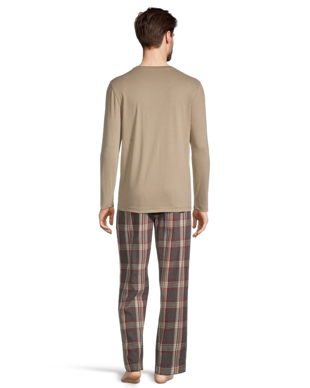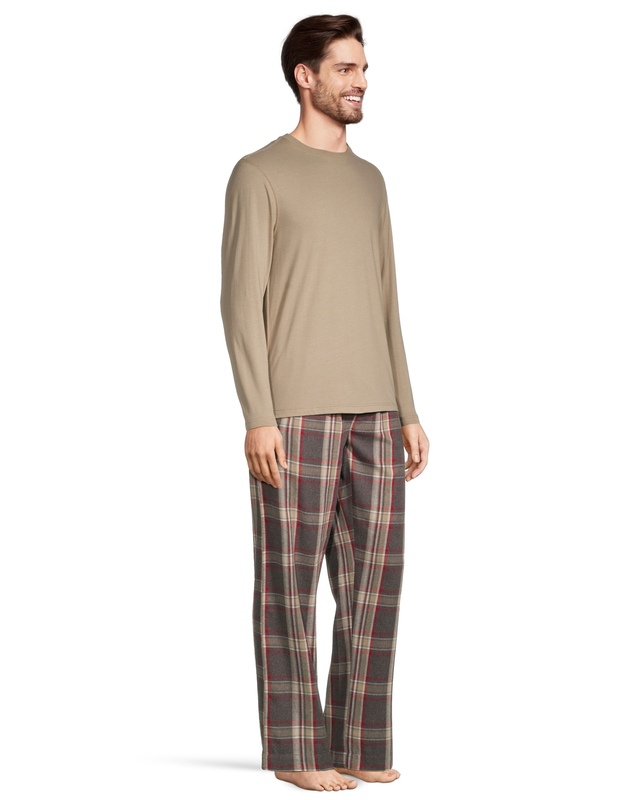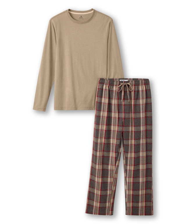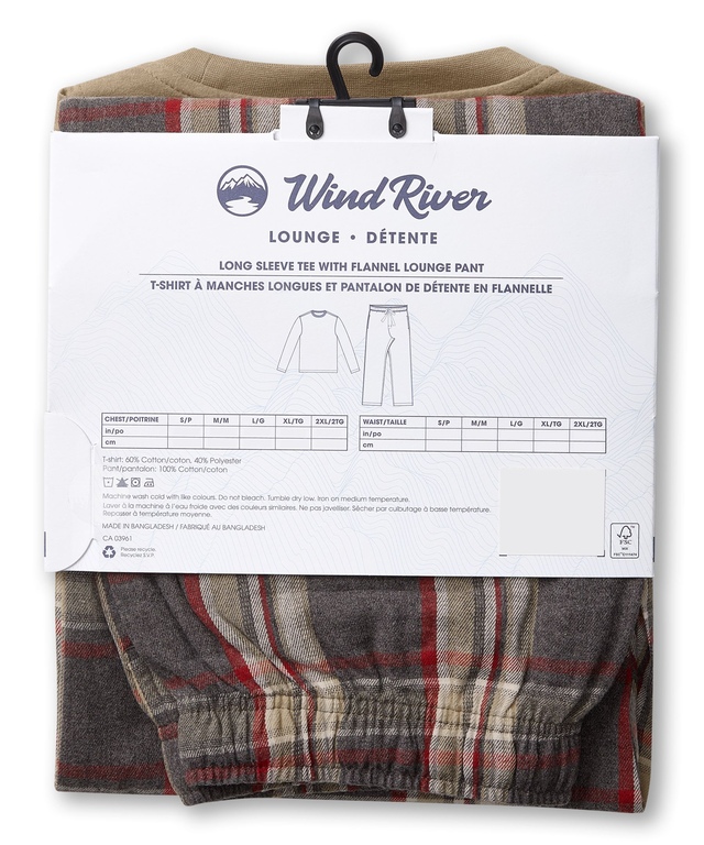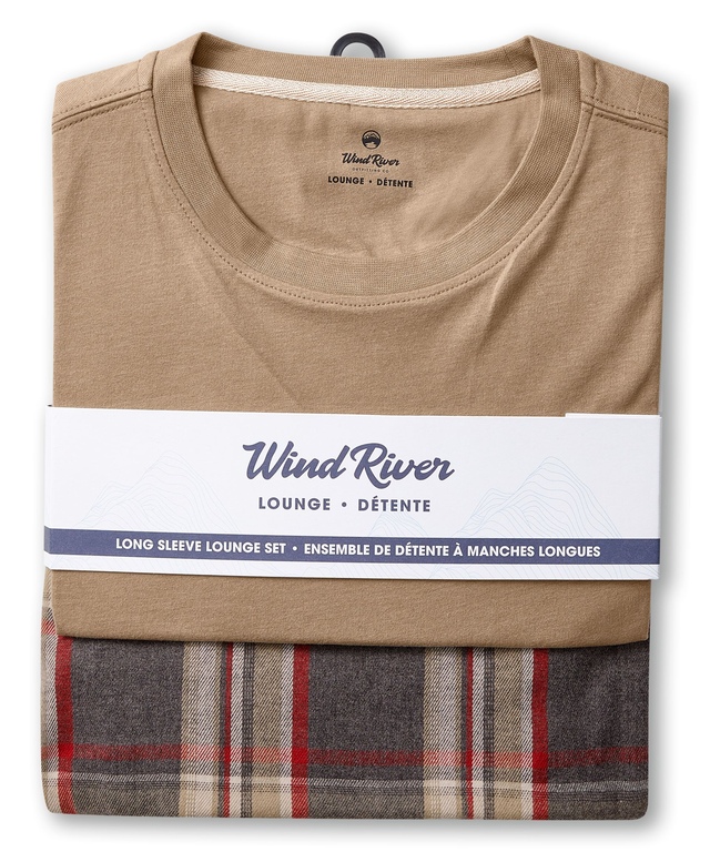 Now that chilly nights are once again upon us, our WindRiver flannel pajama set will be a welcome companion. The solid colour long-sleeve tee is paired with traditional plaid pants - great for lounging and perfect for sleeping.