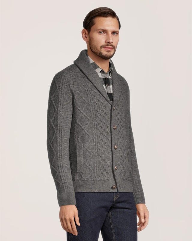 This traditional Cable patterned cardigan is part of our Windriver Heritage collection. It's a classic that will never go out of style. We designed this shawl-neck sweater in a soft and warm yarn, making it perfect for your weekend outdoor adventures.