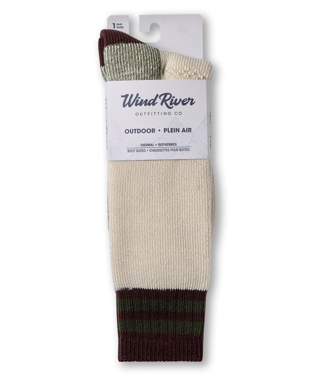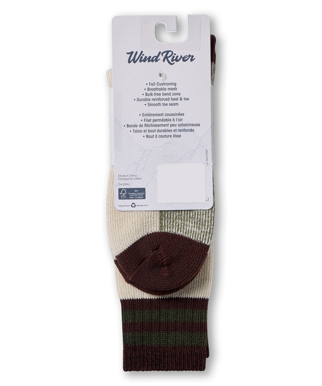 Our WindRiver heavyweight thermal crew socks are made from an 88% acrylic, 1% spandex & 11% nylon blend. It's known for its softness and itch-free yarns that help to keep your feet warm and comfortable. Extra comfort factors include mesh vents, a bulk-free bend zone and underfoot cushioning.