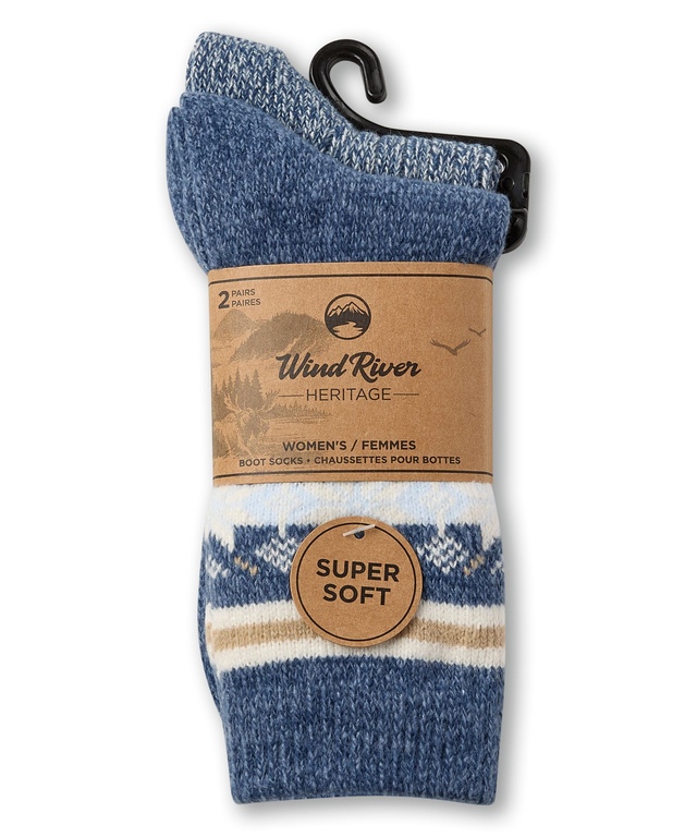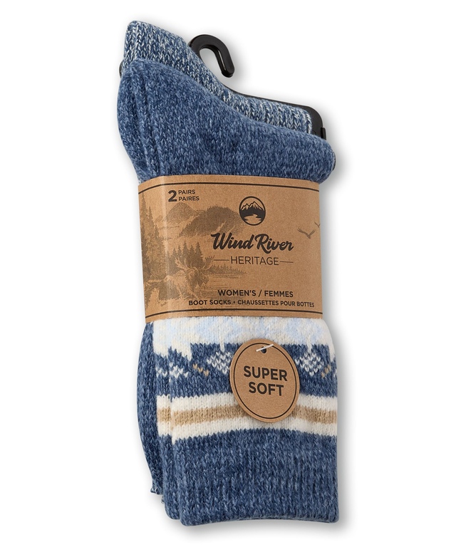Add cozy warmth inside your boots wearing our Nordic-patterned socks from the WindRiver Heritage Collection. We added Spandex to the yarn to improve the fit. These winter socks have non-irritating smooth toe seams and rib-knit cuffs to keep them up where they belong.