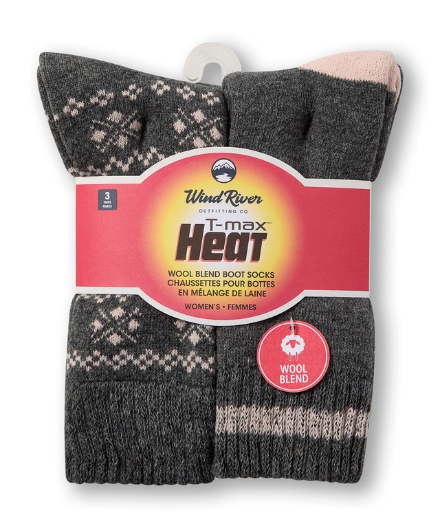 WindRiver brings you comfort, warmth and breathability times three. These wool-blend socks feature our signature T-MAX HEAT® technology offering superior heat retention and temperature regulation. Feel-good features include non-chafing toe seams comfort welts and cushioned soles. Three pairs with all that going for them keep your feet happy longer.