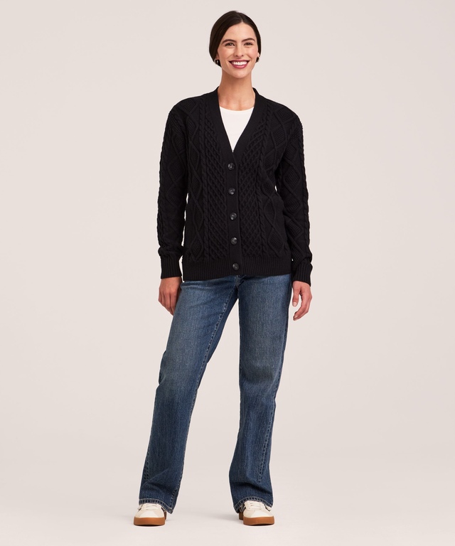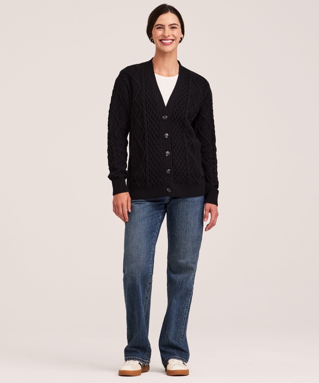 A classic cableknit cardigan from WindRiver. Knitted in a cotton and Merino wool blend, it breathes naturally and keeps you warm and cozy. That makes it ideal for your cool weather outdoor adventures.
