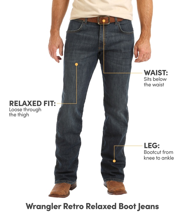 These Retro jeans are a modern take on Wrangler's authentic Western jeans. The versatile design has a comfortable mid rise with a relaxed fit through the seat and thigh. The leg opening on these jeans fits easily over your boots.